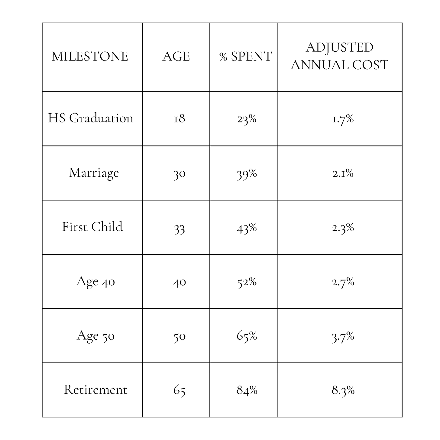 Looking at life through the lens of milestones reveals how time becomes increasingly valuable as we age. Each year costs more as a percentage of the life we have remaining. By the time you reach retirement, each year is over 8% of your remaining life. This highlights why the decisions we make at each stage of life carry increasing weight.